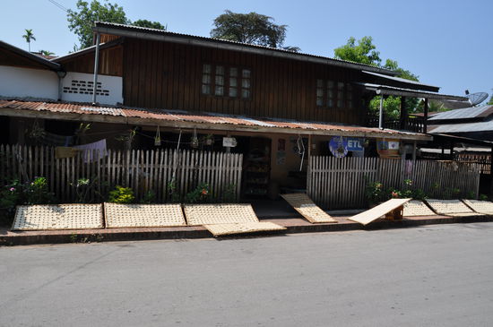 Kleine Reisplatten werden zum trocknen auf ein Bambusgestell gelegt und in die Sonne vor der Haustür gestellt. Lecker!