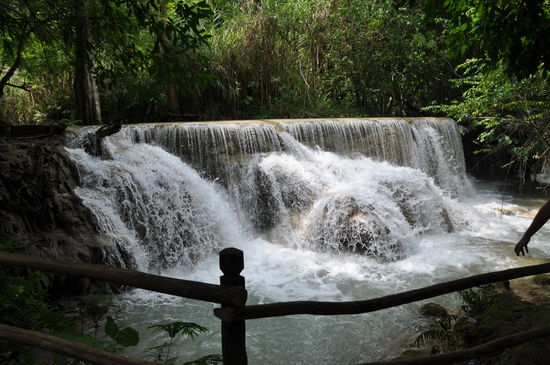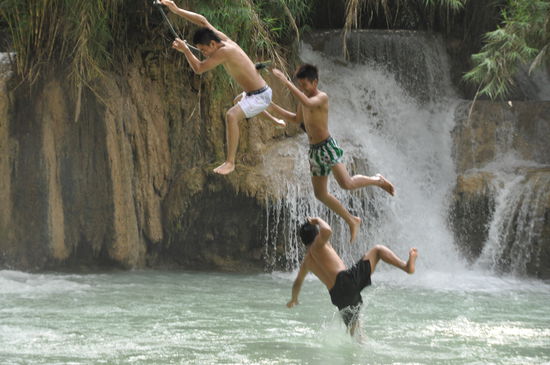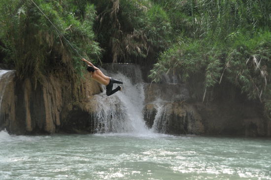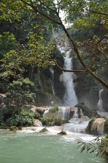 Wir rasten dort kurz und fahren dann weiter zu einer Weberei. Die Frau fallen über mich her, alle wollen etwas verkaufen auch hier bin ich wieder der einzige Gast. Dann geht es zu einem Tempel, der von zwei alten süßen Frauen geführt wird. Thai muss draußen bleiben. Die beiden nehmen mich auf und zeigen mir den Tempel, sie sind begeistert von meiner Kamera und wollen ständig fotografiert werden.  Es herrscht eine sehr entspannte Atmosphäre, auch hier bin ich bis auf drei einheimische Mädchen die einzige im Tempel. Nach dem Tempelbesuch fahren wir nach Luang Prabang zurück, gehen dort etwas essen und fahren  weiter zum Wasserfall Kuang Xie. Er ist wunderschön und man kann schwimmen und von einem Baum ins kühle Nass springen. Wir bleiben dort bis kurz vor Sonnenuntergang. Erfrischt und froh über den  schönen Tag gehe ich nach dem Essen schlafen.