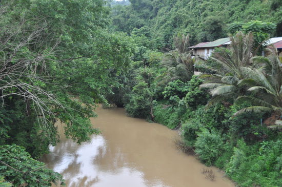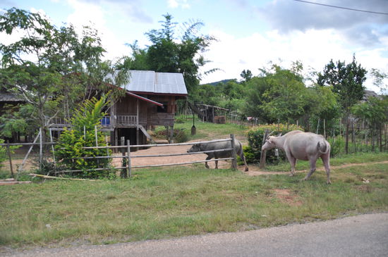 Am Nachmittag kommen wir in Nong Kiao an. Dort gehen wir in ein wunderschönes Guesthouse (Nong Kiao Riverside Lodge). Wir bewohnen einen Bungalow, der auf hohel Stelzen über dem Fluss schwebt. Der Bungalow ist riesig groß, mit eigner Terrasse und einem spektakulären Blick auf das Karstgebirge. Das ist die teuerste Unterkunft die ich bisher hatte, aber jeden Cent wert. Nach den Strapazen der letzten Tage genau das richtige. Nachdem wir unser Gepäck deponiert haben unternehmen wir eine kleine Wanderung. Eigentlich wollten wir uns ein Moped mieten, aber Thai schafft es diesmal nicht eines zu organisieren. Die Fahrräder, die zum GH gehören dürfen lt. Gouverment nicht mehr vermietet werden. Das haben wir nun schon öfters erlebt. Vermutet wird, dass die Tuk-Tuk-Fahrer sonst keine Geschäfte mehr machen können und aus diesem Grund verboten wird an Touris Fahrräder oder Mopeds zu vermieten. Die Landschaft ist fantastisch. Wir kommen durch zwei kleine Dörfer, die Leute sind gerade dabei gemeinsam ihr allabendliches Bad an einer Wasserstelle zu nehmen. Frauen in Sarongs gehüllt und Männer in Shorts oder langen Hosen waschen sich an einem Platz. Kinder springen herum und vergnügen sich mit dem kühlen Nass. Am Bungalow angekommen, wird erst einmal ausgiebig geduscht und die Terrasse in Beschlag genommen. Relaxen ist angesagt. Das Klima hier ist sehr angenehm, nicht zu warm und nicht zu kalt.