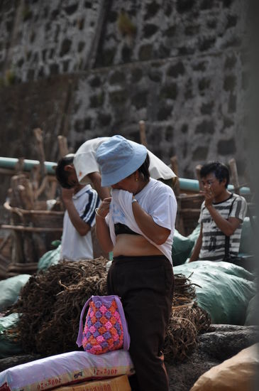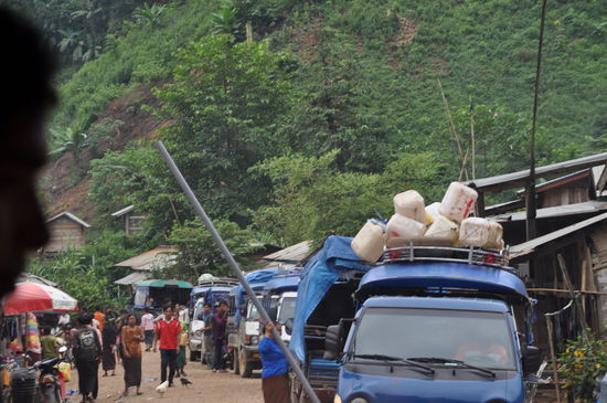 Nach ca. 2 Std. gab es den ersten unfreiwilligen Stopp. Der Bus raste in eine aufgebrochene Stelle in der Straße. Da fehlte einfach ein Stück Straße und zwar fast über die gesamte Breite, ein riesen Spalt tat sich auf. Nun hing der Bus mit der gesamten Nase bis zur Scheibe drin. Wir mussten alle aussteigen und versuchen auf die andere Seite der Spalte zu gelangen. Ich ließ die erfahrenen Locals vorgehen und hing mich mehr oder weniger an die Versen eines Locals, der mir sicher erschien die andere Seite zu erreichen. Thai kam erst viel später nach. Nun standen wir auf der anderen Seite und schauten zu wie zwei Leute versuchten den Bus aus dem Spalt zu schieben. Ich musste echt lachen. Dass das nicht funktionieren kann war klar, aber scheinbar nur mir, sonst lachte niemand. Sie sahen alle sehr ernst aus und übten sich in Geduld, ich tat es ihnen gleich und setzte mich auf meine Schuhe, wie es die Einheimischen machen. Die drei Busfahrer standen beratschlagend vor dem Bus, es kamen immer mehr LKWs und Busse von beiden Seiten. Alle stellten sich dazu und debattierten über den weiteren Verlauf. Nach ca. 1 ½ Std. kam ein Mann mit einem Brecheisen, ein anderer mit schweren Stahlseilen. Das Stahlseil wurde auf der Rückseite des Busses und an einem dahinter stehenden LKW befestigt. Der Mann mit der Brechstange stieg halb in den Spalt hinunter (sah super gefährlich aus) und stemmte sein Brecheisen unter den Bus. Dann bewegte sich etwas und mit einem heftigen Ruck und der Bus bäumte sich vorne auf, schoss er nach hinten raus. Ich konnte mir gar nicht vorstellen, dass er noch funktionieren sollte. Nachdem wieder alle eingestiegen waren, fuhren wir im Schneckentempo ein kleines Stück, dann sah der Busfahrer ein, dass es nicht weiter ging, zumindest nicht so. Er bekam keinen niedrigen Gang geschaltet und das war zum vorwärtskommen in den Bergen zwingend. Wir hielten. Dann fingen die Busfahrer und der Helfer an, den vorderen Teil (sprich wo ich saß) frei zu räumen, meine Beine musste ich nun noch irgendwie auf meinen Sitz bekommen. Warum: Nun, um an die Kurbelwelle zu kommen, mussten sie die Klappe die hinter dem Motor lag (sprich wo meine Füsse standen) öffnen. Dann wurde geklopft, gestopft, geflickt, keine Ahnung was sie da machten, jedenfalls dachte ich ich müsste zwischendurch mal meine Beine auf dem Busfahrer ausstrecken, ich spürte meine Beine nicht mehr. Das dauerte dann auch noch mal ca. eine Stunde bevor der Bus wieder eingeräumt wurde, aber leider nicht mehr ganz so ordentlich und nun saß ich wie ein "V" da. Alle lachten, auch die Busfahrer hatten ein Einsehen, dass das der sichere tot für meine Beine wäre. Also, noch mal ausräumen und etwas ordentlicher einräumen. Na ja, ein bisschen besser, aber nicht wirklich gut. Ich versuchte es. Unterwegs stieg eine Frau mit einem kleinen Baby ein, sie hatte einen Platz neben mir auf den Reissäcken gefunden, sie hatte keine Decke dabei um das Baby darin einzuwickeln und es war mittlerweile echt kalt in den Bergen. Ich gab ihr mein Kissen und meinen Seidenschlafsack, so dass sie den kleinen betten konnte. Die Straße war unglaublich schlecht. Die Frau neben mir bettete immer wieder ihren Kopf auf meinen Schultern, sobald sie merkte wo sie sich befand zog sie ihren Kopf schnell zurück. Jedoch lässt der tiefe Schlaf alle Hemmungen fallen und irgendwann lag ihr Kopf schwer auf meiner Schulter. Na ja mit schlafen war nichts und ich versuchte zu relaxen und mir zu sagen, das erlebst du nicht alle Tage. Ich war total erschöpft, die Beine taten mir weh, oder waren sie abgefallen?? Letztendlich waren wir 21 Stunden unterwegs, davon 4 freiwillige Stopps und einen unfreiwilligen.