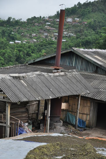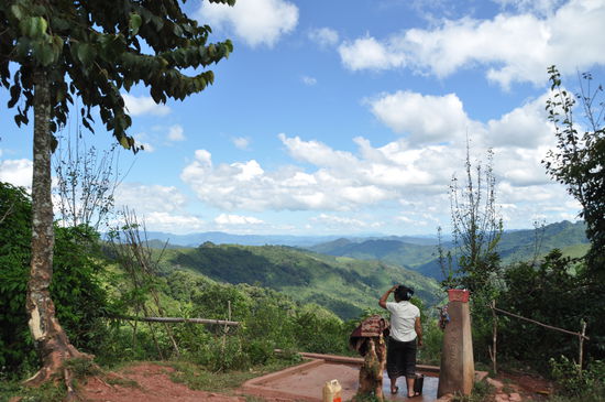Im Ort gibt es keine Mopeds oder Motorräder zu leihen. Es gibt nun mal keine touristische Infrastruktur. Thai fragte bei einer Werkstatt nach, doch die wussten auch keinen Rat. So standen wir herum, Thai unterhielt sich mit den Leuten, es kamen immer mehr hinzu um mich anzuschauen. Und plötzlich strahlte Thai und meinte, der Dorfpolizist hätte ein Motorrad, das er uns für 200.000 Kip (20 Dollar) für den Tag geben würde. Wir waren echt froh, so konnten wir doch die Leute in den Dörfern besuchen, die uns auf der Hochzeit in Luang Namtha eingeladen hatten. Und los ging es. Wir fuhren nur Pisten, kamen durch Dörfer ethnischer Minderheiten (Hmongs und Khmus). Nach einer Weile fanden wir auch das Hmong Dorf und die Familie wo wir eingeladen waren. Allerdings waren alle am Arbeiten und nur der Opi war da. Die Menschen hier leben hauptsächlich vom Teeanbau und ist berühmt für die 400 Jahre alten Teebäume. Der Opi schenkte uns Tee ein und bot uns Melone zum essen an. Nach einer Stunde kam einer der Söhne, den wir auch auf der Hochzeit getroffen hatten. Wir plauderten noch eine Weile und fuhren dann weiter. Zeitweise musste ich laufen, denn wir mussten zum Teil durch riesige Pfützen fahren und da war manchmal fast kein herauskommen mehr. Wir sahen aus wie Schweine die sich im Dreck gesuhlt hatten. Aber so ist das nun mal. Es war eine tolle Tour und am Abend besuchten wir noch eine Teeplantage in der ich Tee für meine Lieben zu Hause kaufte (von den 400 Jahre alten Teebäumen, die übrigens riesig groß sind - zwischen 6 und 10 Meter hoch). Dann besuchten wir noch eine Stupa oberhalb von Phongsaly und hatten einen tollen Blick auf den Ort und die umliegenden Berge. Als wir am Guesthouse ankamen, spielteein Mädchen mit ihrer Mama Federball. Wir fragten, ob wir uns auch beteiligen düfen und die Mutter war erleichtert nun zwischendurch eine Pause machen zu können. So spielten wir mit dem Mädchen abwechselnd Federball bis es dunkel wurde. Dann gingen wir Poolbillard (mit nur halbvollen und 2 vollen Kugeln ) spielen und aßen bei einer Privat- Frau, die Thai fragte ob sie für uns etwas kochen würde zu Abend. Sie war total nett und wir saßen noch lange zusammen und redeten über Laos und Deutschland. Sie und ihre kleine Tochter waren sehr neugierg. Auf dem Weg zum Guesthouse fiel es uns schwer den richtigen Weg zu finden, da die Laternen schon ausgeschaltet waren. Und da es hier kein Nachtleben gibt lag ich um 22 Uhr im Bett und war mal wieder einfach zu müde zum schreiben aber glücklich über den ausgefüllten und sehr interessanten Tag.