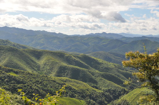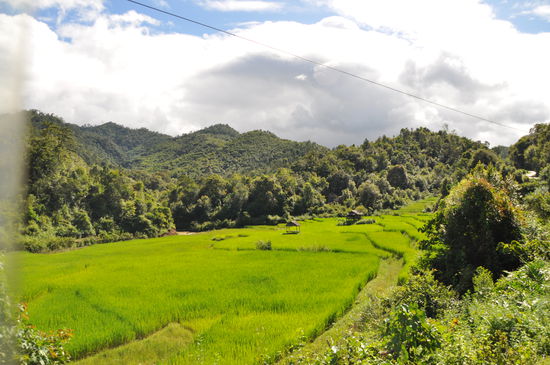 Da es nun hier nichts mehr zu machen ist, denn alles was zu Fuß zu erreichen ist, haben wir uns angeschaut, entschließen wir uns mit dem Bus nach Xam Neua zu fahren (15 Std.). Thai erkundigt sich wann der Bus geht und wir erfahren, dass er erst so gegen 21 Uhr (genau kann man das nie sagen, es kann auch sein, dass er gar nicht kommt) geht und nicht klar ist, ob wir Platz darin bekommen, denn er kommt aus Vientiane. So entschließen wir uns, lieber mit einem Minibus nach Luang Prabang) zu fahren (8 Std.) und von dort nur das Gefährt zu wechseln und weiter nach Xam Neua zu fahren (nochmals 15 Std.). In Luang Prabang ist die Chance größer mitgenommen zu werden. Gesagt getan. Um 13.30h fährt der Minibus los, um 16 Uhr sind wir Luang Prabang, um 17 Uhr kommt der Bus aus Vientiane an (beladen bis unter das Dach, wir finden aber zwei Plätze, sogar nebeneinander). Und sofort geht es los. Bald wird es dunkel und wir können nichts mehr sehen. Ich versuche zu schlafen, aber es ist so eng, die Sitze sind einfach nicht für Europäer gemacht. Es ist eine richtige Quälerei und ich fühle das erste Mal einen Zustand von großer Erschöpfung. Der Bus hält überall, man hat das Gefühl an jedem Busch, an jedem Strauch. Sobald er hält wird das grelle Neonlicht eingeschaltet und wenn man bis dahin geglaubt hatte noch zu schlafen wurde man eines besseren belehrt. Dann stoppt der Bus so gegen 3 Uhr in der Nacht und alle müssen aussteigen. Ein Erdrutsch hat die Straße unter sich begraben. Wir werden aufgefordert durch die gelbe Erdmasse zu waten und auf der anderen Seite des Erdrutsches in sicherer Entfernung auf den Bus zu warten, er würde versuchen durch zu kommen. Durch die Schlammasse zu waten war gar nicht so einfach, denn ständig blieb der Flip Flop stecken. Auf der anderen Seite angekommen, mussten wir zwei Stunden auf den Bus warten. Ich hätte sowieso nicht gedacht, dass er es schafft und es war sicherlich eine sehr gefährliche Angelegenheit. Auf der einen Seite der Erdrutsch und auf der anderen Seit die Schlucht und in der Schlucht der Fluss. Sie überspannten die reifen des Busses mit schweren Tauen (ähnlich wie schneeketten). Dann fuhr der Bus los, oder besser er rutschte los, es sah unglaublich gefährlich aus. Auf der anderen Seite angekommen fuhr er an uns vorbei und wir mussten ihm ein Stück durch die Dunkelheit (es war stockdunkel) hinterher laufen. Dabei trat ich in einen Wasserbüffelhaufen (meine Vermutung), ich spürte nur, wie eine weiche Masse sich über den Flip-Flop-Rand ergoss um dann meine Zehen bis über den Knöchel zu umspannen. Es stank gewaltig und ich hatte nicht wirklich Zeit mich davon zu befreien. Thai stützte mich zwar bei dem Vorhaben, die Masse los zu werden, aber schnell war klar, dass das ein nicht erfolgsversprechende Aktion war. Im Bus angekommen versuchte ich mich meinem Schuhe zu entledigen und streckte ihn so weit wie möglich unter den Vordersitz. Im Nu stank der ganze Bus. Ich ließ mir nichts anmerken, der Geruch könnte ja auch von jemand anderem kommen . Ich glaube ich empfand mich in diesem Moment so schmutzig wie noch nie in meinem Leben. Am nächsten Tag 12 Uhr hielten wir um etwas zu essen. Dort sah man nun das ganze Ausmaß. Nicht nur meine Füße, sondern auch meine Hose war bis über die Knöchel vermatscht und verschissen . Ich ließ es so wie es war, es war ja auch schon etwas angetrocknet und auswaschen würde die Sache nur noch verschlimmern. Der Bus war nun nicht mehr ganz voll und Thai konnte auf zwei andere Sitze ausweichen. So hatte jeder für die langen Glieder zwei Sitze. Hach schön. Aber nicht lange . Nach einer Weil stieg ein älterer sehr kleiner Mann ein, der es sich nicht nehmen ließ sich neben mich zu pflanzen. Es vergingen sicher 10 Minuten, ohne dass er einmal den Blick von mir abwandte. Dann kam sein Arm in meine Seite, ich schaute ihn an und er lachte mich zahnlos an und zeigte auf meine Kamera. Er wollte Bilder sehen. Ich zeigte ihm welche und er schwenkte immer den Kopf hin und her und tat begeistert. Dann schlief ich ein, tief und fest, bis ich plötzlich einen Ellenbogenschlag in den Rippen spürte. Ich schreckte auf, dachte es wäre etwas passiert, nein, der alte Mann zeigte auf ein Reisfeld auf dem gerade geerntet wurde und zeigte auf meine Kamera, ich sollte Bilder machen. Das ging natürlich alles so schnell, dass die Szenerie schon vorüber war, bis ich meine Kamera ausgepackt hatte. Zum Trost machte ich ein paar Bilder ohne arbeitende Leute im Reisfeld und er war zufrieden. Nach ca. 24 Stunden Busfahrt noch entspannt Bilder zu machen fiel mir in dem Moment wirklich schwer. Dafür weckt er mich war mein erster Gedanke, aber für ihn war es eben sehr wichtig. Ich schlief noch mal weg bis ich irgendwann spürte, dass ich einen schweren Kopf auf meiner Schulter ruhen hatte, es war nicht meiner, nein, es war der Kopf meines kleinen Nachbarn. Auch er war eingeschlafen und bettete genüsslich seinen Kopf auf mir . Ich bat Thai ein Bild zu machen, es sah einfach zu süß aus. Um 15 Uhr kamen wir in Xam Neua an. So schön! Vor allem die Fahrt durch den Dschungel, durch die Dörfer, vorbei an Flüsschen und Wasserfällen. Xam Neua liegt in einem Tal 1200m hoch und das Klima ist sehr angenehm. Der Bus schraubte sich über kleine Straßen die Serpentinen rauf und runter. Immer wieder atucht man in kleine Täler ab, oder es eröffnet sich ein wunderschöner Blick auf die umliegenden Berge.