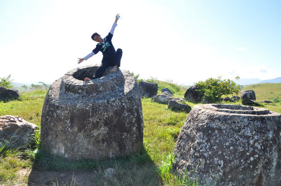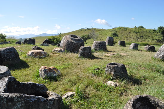 Um 8 Uhr machten wir uns mit unserem gemieteten chinesischen Motorrad (keine guten Bikes) auf den Weg zu den Fields of Jars, wir sind die ersten Gäste. Es ist mittlerweile 9 Uhr und es ist schon unglaublich heiß. Die Steinkrüge stehen auf Feldern verteilt. Manche messen 3 Meter Höhe und 3 Meter Durchmesser. Unvorstellbar wie sie diese Töpfe dahin geschafft haben. Aber es wurden ja auch Pyramiden gebaut und die Steine dafür angschleppt. Bis heute ist nicht klar, aus welcher Zeit die Krüge stammen und es gibt nur Vermutungen darüber zu was sie hergestellt wurden. Vermutet wird, dass sie von den reicheren Personen zur Huldigung der Toten Angehörigen hergestellt wurden. Allerdings nicht als Gräber. Knochen wurden unter riesigen Steinplatten gefunden, die ebenfalls in den Feldern vereinzelt auftauchen.
