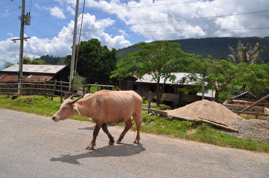 Auf dem Weg nach Xam Neua. In der Nacht mussten wir mal wieder aussteigen, da die Straße verschüttet war und der Bus alleine sich durchkämpfen musste. Nicht nur dass ich mich durch den Schlamm kämpfen musste, ich machte auch noch Bekanntschaft mit einem riesigen Wasserbüffelhaufen