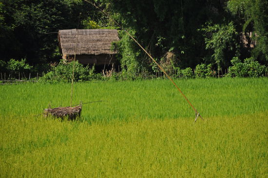 So gegen Mittag fuhren wir zu den Hot Springs, die ganz in der Näher der vietnamesischen Grenze liegen. Es ist weit (ein Weg 60 km) und heiß und das Motorrad ist total unbequem, mein Hintern spüre ich schon nach der Hälfte der Strecke nicht mehr. Wir kommen vorbei an Reis- und Maisfeldern, rundherum sieht man die mit Dschungel besetzten Berge. In diese Gegend hat es sicherlich noch keine Handvoll Touris verschlagen. Allerdings sieht man, dass die dieser Ort ein Reiseziel für die Einheimischen ist. Dort angekommen gehen wir erst einmal etwas essen und wieder einmal bin ich die Attraktion des Tages, innerhalb kürzester Zeit füllt sich das Restaurant mit Einheimischen, die sich ganz ungeniert an den Tisch stellen und mir beim Essen zusehen. Ich bitte sie doch Platz zu nehmen, einige folgen meiner Bitte, andere bleiben stehen und kichern. Keiner kann auch nur ein Wort Englisch und Thai hat alle Hände voll zu tun zu übersetzen und mir Fragen zu stellen. Wieder einmal bin ich froh ihn dabei zu haben, ansonsten wäre keine Kommunikation möglich. Wir werden zum Lao Lao (Reisschnaps) eingeladen. Da man ja nicht ablehnen darf, trinke ich einen und sage, dass aber mein Fahrer trocken bleiben muss, alle lachen, dafür gibt es kein Verständnis, aber Thai bleibt standfest, auch wenn er kritische Blicke erntet. Die Hot Springs an sich sind eher eine Enttäuschung. Ich dacht wir könnten uns hineinlegen (wie in Costa Rica), aber außer einem heißen Pool, der ziemlich gefährlich blubbert gibt es nichts. So ist doch das Highlight eher die die Leute um mich herum als die Hot Springs. Nach einer ausgiebigen Pause fahren wir zurück und sind gerade noch rechtzeitig am Guesthouse bevor es zu regnen beginnt. Am Abend gehen wir essen und dann ab in die Koje. Für mich heißt es früh aufstehen, denn dann fahre ich nach Luang Prabang. Thai fährt weiter nach Vientiane, wo wir uns dann in drei Tage später treffen wollen.
