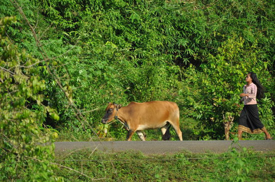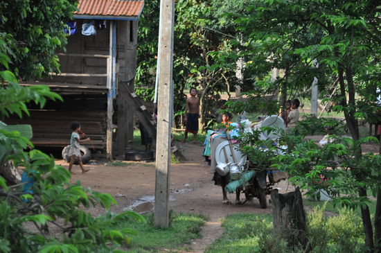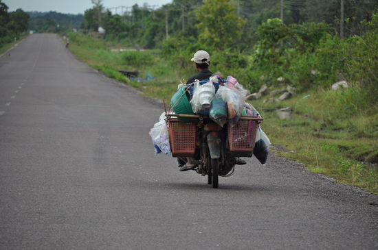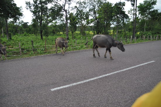 Heute Morgen um 6 Uhr aufstehen, zum Bikeshop Vertrag machen und mit dem Bike und kleinem Gepäck (großes bleibt im Bikeshop) fahren wir in den Süden von Laos. Unser erstes Ziel ist Savannaketh, 500 km entfernt von Vientiane. In strömendem Regen starten wir, es ist unangenehm, aber es ist nicht kalt. Unser Gepäck ist gut in wasserdichten Säcken verpackt. Mit der Zeit tut der Po ganz schön weh, aber da hilft nichts, wir müssen die ersten 500 km in einem zurück legen. Die Straße ist in einem recht guten Zustand. Allerdings ist hier in Laos mit schnellfahren nichts. Auf der Straße stehen oft Wasserbüffel, Ziegen liegen auf der Straße herum, Hunde queren, Katzen jagen Katzen, Kinder spielen. Außerhalb der Ortschaften hat man manchmal die Möglichkeit etwas schneller zu fahren, aber nicht schneller wie 80 kmh, alles andere ist zu gefährlich, es gibt immer wieder Überraschungen. Den gesamten Weg regnete es, ich war so nass, wenn wir zum Tanken hielten und ich vom Bike stieg, hinterließ ich beim Weggehen eine riesige Pfütze. Aber das ist für die Leute nichts ungewöhnliches, alle hinterlassen bei Regen pfützen . Für die 500km brauchten wir 9 Stunden, mit einer halben Stunde Mittagspause und 4 Tankstopps. Ich war heilfroh als wir am Abend ankamen. Es ist eben schon lange her, dass ich so lange auf einem Bike saß. Das Guesthouse in Savannaketh ist das gleiche wie bei meinem ersten Stopp vor fast zwei Monaten. Außer duschen, essen fassen ist an diesem Abend nichts mehr. Thai geht nicht mal mehr essen, er geht sofort schlafen. Er ist ja auch die meiste Zeit gefahren, was er natürlich auch gerne tat.