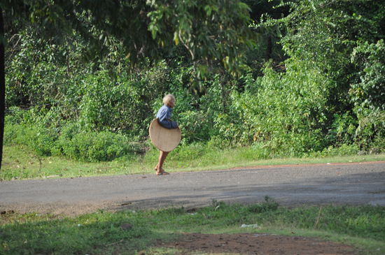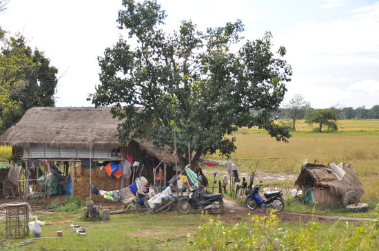 Heute Morgen ging es schon wieder besser, wir frühstückten und  gingen dann zur Mietstation das Bike abholen und fuhren zu Thais Verwandtschaft 60 km außerhalb der Stadt. Sie leben auf dem Land, umgeben von Reisfeldern. Es gibt keine dörfliche Infrastruktur, nur vereinzelt sieht man Häuser oder Hütten in Reisfeldern stehen. Das Haus ist ziemlich groß, allerdings fehlt es an Einrichtungsgegenständen, bis auf einen kleinen Schrank gibt es nichts. Man sitzt auf dem Boden auf Matten. Das Haus hat eine große Veranda und eine kleine Holzpritsche und ein kleiner Tisch stehen dort. Die Küche hat eine gemauerte Ablage für Geschirr, auch dort gibt es weder Schränke noch Spülbecken. Fließend Wasser gibt es nicht. Das Wasser wird aus Tonnen geschöpft, die vom Regen gespeist werden.