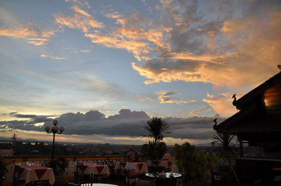 Diesen Luxus gönnte ich mir zum Abschied: Ein Hotel mit Swimmingpool auf dem Dach und Blick über die Stadt Vientiane.