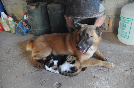 Auch der Hund versucht seine Aufmerksamkeit auf sich zu lenken. Dieser putzige große Kerl ist mit Ottern aufgewachsen und verhält sich wie sie --> rollen, grunzen und quietschen!