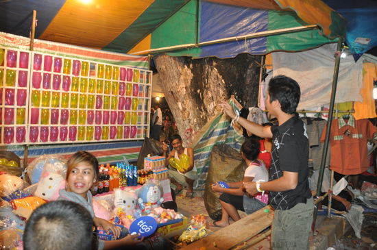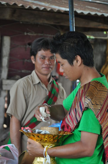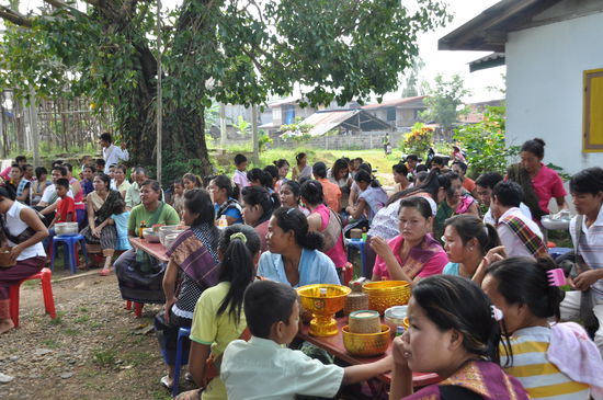 Auch heute arbeitete ich etwas am Block, ging ein bisschen einkaufen und packte meinen Rucksack für den übernächsten Tag. Pack, die im Guesthouse arbeitet und zwei Tage vorher Geburtstag hatte, und ich gingen zusammen auf den Nachtmarkt um ein kleines Geschenk für sie zu kaufen. Sie durfte sich etwas aussuchen, sie war so scheu, aber überglücklich, noch nie (und das muss man sich mal bewusst machen) hatte sie etwas geschenkt bekommen und für sie war das ein teueres Geschenk. Ich kaufte ihr einen Gürtel für 5 Dollar. Es war ein hartes Stück arbeit herauszubekommen was sie für einen Wunsch hatte. Am Abend gab es dann eine Party für mich. Zusammen waren wir 15 Personen, zuerst aßen wir tolles Lao-Food mit Fisch, Fleisch, Gemüse, Nudeln, Reis, Palmherzsalat, noch einen anderen Salat (Muonglao-Special), Suppe und noch andere tausend Kleinigkeiten. Kurz bevor die Party los ging kletterte einer der Staffs auf einen Frangipani-Baum um Blüten zu pflücken. Die Blüten duften so toll. Ich dachte sie wollten die Tafel schmücken, aber nein, sie machten mir eine Kette daraus. Dann nahmen sie mich offiziell in ihre Familie auf. Ach es war so Herz-Aller-Liebst . Nun bin ich schon in drei Familien in Laos zu Hause.