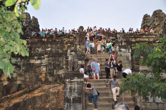 Am nächsten Morgen um 8.30 wurde ich von Boony und dem Guide am Hotel abgeholt. Ich überließ es ihm die Tour zu gestalten, in der Hoffnung mich gut zu beraten, was er auch wirklich tat. Auch mit meinem Guide hatte ich unglaubliches Glück. Er ist noch sehr jung (26 Jahre) und gerade seit 2 Monaten verheiratet. Die Tour gestaltete sich als hoch interessant und wir besuchten an diesem Tag die wichtigsten großen Tempel und die alte Tempelstadt Angkor Thom. Ich gehe hier nicht auf die einzelnen Tempel ein, das würde Bücher füllen. Nur so viel vielleicht, dass die Tempel von Angkor 1992 in die UNESCO-Liste des Weltkulturerbes aufgenommen wurde und auf einer Fläche von 300 km2 im ländlichen Gebiet zwischen dem See Tonle Sap und den Kulen-Bergen liegt Erwiesen ist, dass Angkors ältestes Bauwerk auf das Jahr 802 zurückgeht. 1219 wurden nach meinen Recherchen die letzten Tempel errichtet. 1431 fielen die Siamesen dort ein und ein Jahr später verlegte Ponhea Hat seinen Hofstaat ins südliche Phnom Pen und überließ Angkor dem Dschungel. 1570 entdeckte König Satha Angkor Thom im Dschungel und er verlegte seinen Sitz dorthin. Doch schon 1594 zog er aus unbekannten Gründen wieder weg und überließ abermals Angkor dem Dschungel. Dann fielen die Tempelstätten bis ins 19. Jahrhundert in einen langen Dornröschenschlaf, bis eine europäische Forschergruppe ins Land durfte. Der erste ausführliche Bericht über Angkor Wat schrieb 1858 der Französische Missionar Charles-Emile Bouillevaux. Doch erst 1864 gerieten die Tempel durch die Tagebücher des Botanikers Henri Mouhot an die Weltöffentlichkeit. 1867 entstanden die ersten Fotografien. Es gibt nichts vergleichbares, was ich bisher gesehen habe, was diese majestätische Erhabenheit ausdrückt. Am Abend, bei Sonnenuntergang verließen wir diese mystische Stätte. Es ist gut in der Regenzeit hier zu sein, denn in der Hauptsaison sind hier unglaubliche Massen von Menschen.