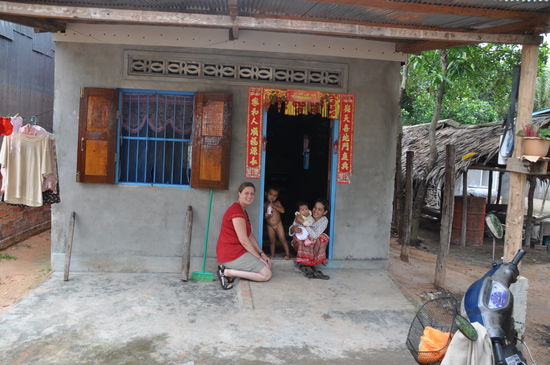 Boonys Frau ist eine bildhübsche Person mit unglaublich lieben und warmen Augen. Die Kleine (wahrscheinlich wird sie eines Tages Alisha getauft) war erst zwei Monate alt. So süß. Boony fragte mich, ob ich ihr einen Namen geben möchte. Ich war völlig verunsichert, jetzt im Nachhinein weiß ich, dass sie ihrem Kind nur einen Namen geben können, wenn sie das Geld für die Zeremonie zusammen haben und das wird wohl noch eine Weile dauern. Der kleine Junge, dessen Name ich leider vergessen habe, war ein richtig kleiner Bengel und hatte vor allem seinen Vater richtig im Griff. Ich spielte ein bisschen Fußball mit ihm um ihn zu besänftigen. Nach und nach kamen immer mehr Kinder und Leute aus der Nachbarschaft um die große fremde Frau (Farang = Langnase, wie uns die Thais und auch die Kambodschaner nennen) zu sehen. War nett und wir stellten uns gegenseitig viele Fragen. Die meisten Leute in Kambodscha leben vom Tourismus, eigene Industrie haben sie nicht. Die Leute, die nicht im Tourismus arbeiteten waren entweder arbeitslos (es gibt aber kein Geld) oder sie waren Farmer mit einem stückchen Land, oder wie Phallins Papa Lehrer und Farmer, da das Geld nur von einem Job nicht reicht die Familie zu versorgen. Boony kommt aus Kratie, Nordöstlich von Phnom Pen und seine Frau aus der Gegend von Phnom Pen. Seine Frau spricht kein englisch, also verständigten wir uns mit Löffel und Gabel und Händen, Füssen und Gesten. In der Area wo sie wohnen leben 700 Familien. Die meisten haben kein gemauertes Haus, sondern nur irgendwelche Bruchstücke von Holz oder Blech oder Plastik zusammengebunden. Boonys Haus ist auch noch nicht fertig, es fehlt noch der Boden. Boony zeigte mir voller Stolz seine Hochzeitsbilder und die beiden sahen echt aus, als wären sie aus dem Märchen von Tausend und einer Nacht entsprungen. So schön.