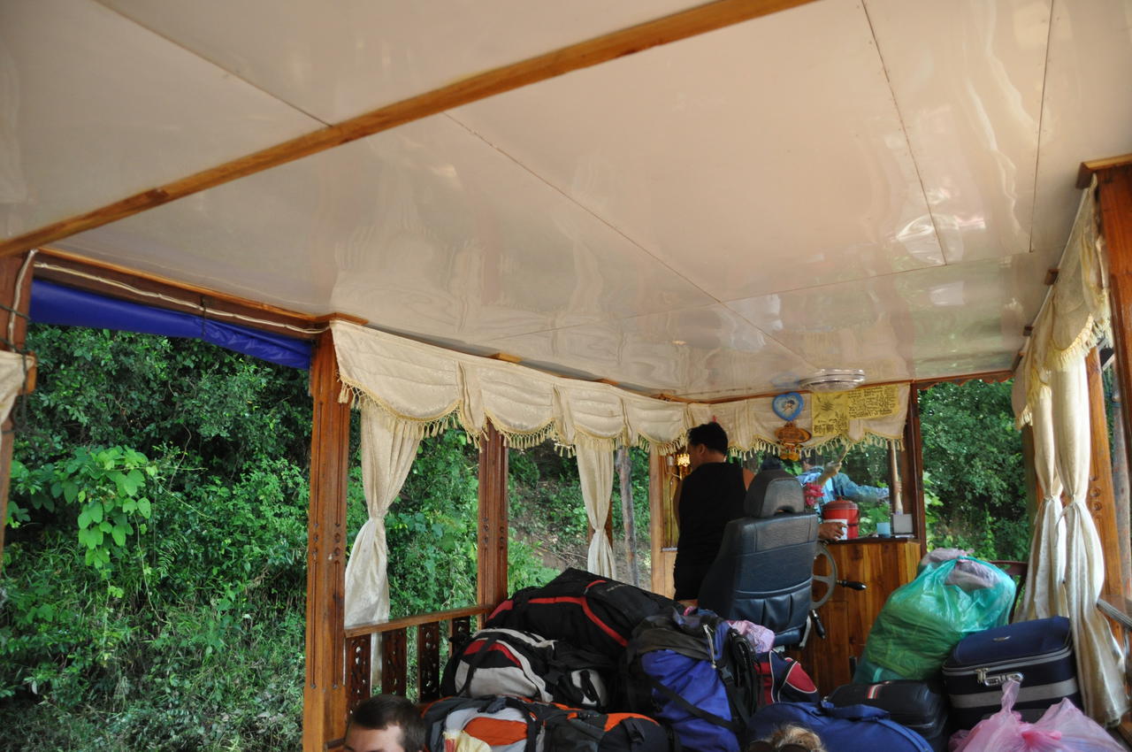 Um 6 Uhr aufstehen, fertig machen, mit dem Tuk Tuk zum Boot. Das Boot sieht aus wie ein langes Stück Holz mit Holzaufbau drauf. Es ist nicht klein. Über die Nase des Bootes steigt man ein, die Seiten sind offen, jedoch gibt es Gardinen, die man bei Bedarf zuziehen kann. Direkt nach dem Einstiegt befindet sich das Ruder, dort thront der Chef des Bootes. Direkt dahinter ist eine große Freifläche auf der Dinge gestapelt werden können oder Leute (vornehmlich lokal people) sitzen können. Das Boot ist 38 Meter lang und ca. 2,50m breit. Nach dem freien Raum kommt eine Stufe nach unten und danach folgen ca. 20 Sitze (je 2 auf jeder Seite), bequeme Lederimitatsitze, die man auch als bett klappen kann. Dann folgen Holzbänke, ca. 10, auf den man nicht unbedingt sitzen möchte. Nach den Holzbänken kommt wieder eine Freifläche und kurz vor einer Wand steht so etwas wie eine Verkaufsbar. Dahinter gibt es zwei Toiletten, die das Geschäftchen direkt in den Mekong transportieren. Danach kommt der Motorraum des Schiffes (der Motor ist riesig) und dann folgt das Haus der Bootsleute, das als Aufsatz auf das Boot gebaut ist. Dort in den Stuben haben sie zwei Räume, ein Küche-, Ess-, Leberaum (mit Fernseher, Sat-Schüssel auf dem Dach, und einen Stapel-Schlafraum. Hinter dem Küchenraum gibt es einen kleinen Balkon, dort befinden sich die Essensutensilien und der Herd in Form einer Feuerstelle.