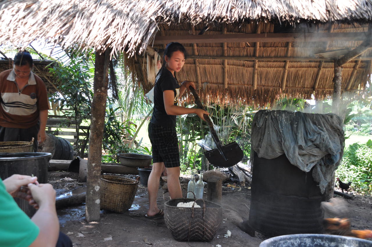 Wir fuhren nochmal auf einen Berg, besuchten verschiedene Villages. Als wir durch eine der Villages kamen, sah Thai, dass gerade vor einem Haus über einer Feuerstelle eine riesige Tonne stand. Er drehte um und wir gingen zur Familie hin. Er sprach zuerst mit ihnen, dann erklärte er mir, dass sie gerade dabei wären Sticky Rice machen. Eine für hier typische Reissorte und die Bearbeitung bedarf einer langen Prozedur. Zwischen 10 und 14 Tage braucht der Reis bis er fertig ist. Im Dorf gibt es 2-3 Stellen wo er hergestellt wird und diese produzieren für das ganze Dorf. Der Reis wird gekocht, dann muss er für ein paar Tage abgedeckt stehen, dann wird er wieder gekocht, danach wieder stehen, zwischendurch wird er immer wieder gewaschen und getrocknet. Die ganze Familie half mit den Reis aus der riesen Tonne zu schaufeln, ihn zu waschen und ihn dann in Tonnen zu verfrachten wo er gären muss. Außerdem stellen sie aus dem Sud einen Reisschnaps (Lao Lao) her. Als wir zus chauten kamen viele Kinder und als sie meine Kamera sahen, mit der ich vorher die Frauen beim bearbeiten des Reises fotografiert hatte wollten sie unbedingt auch fotografiert werden. Manche hielten sich schüchtern im Hintergrund und andere wiederum drängten sich vor die Kamera. Es war ein unglaublicher Spaß als ich ihnen die Bilder zeigte und die Jungs fielen mir um den Hals und freuten sich. Nach einer Weile verabschiedeten wir uns und fuhren nochmal zum Markt um für mich einen Sarong und ein passendes Oberteil für die Hochzeit zu finden. Der arme Thai, es war gar nicht so einfach und er meinte er wäre noch nie mit einer Frau Kleider kaufen gewesen, aber er machte seine Sache echt gut. Bis am Abend become ich einen Sarong geschneidert.