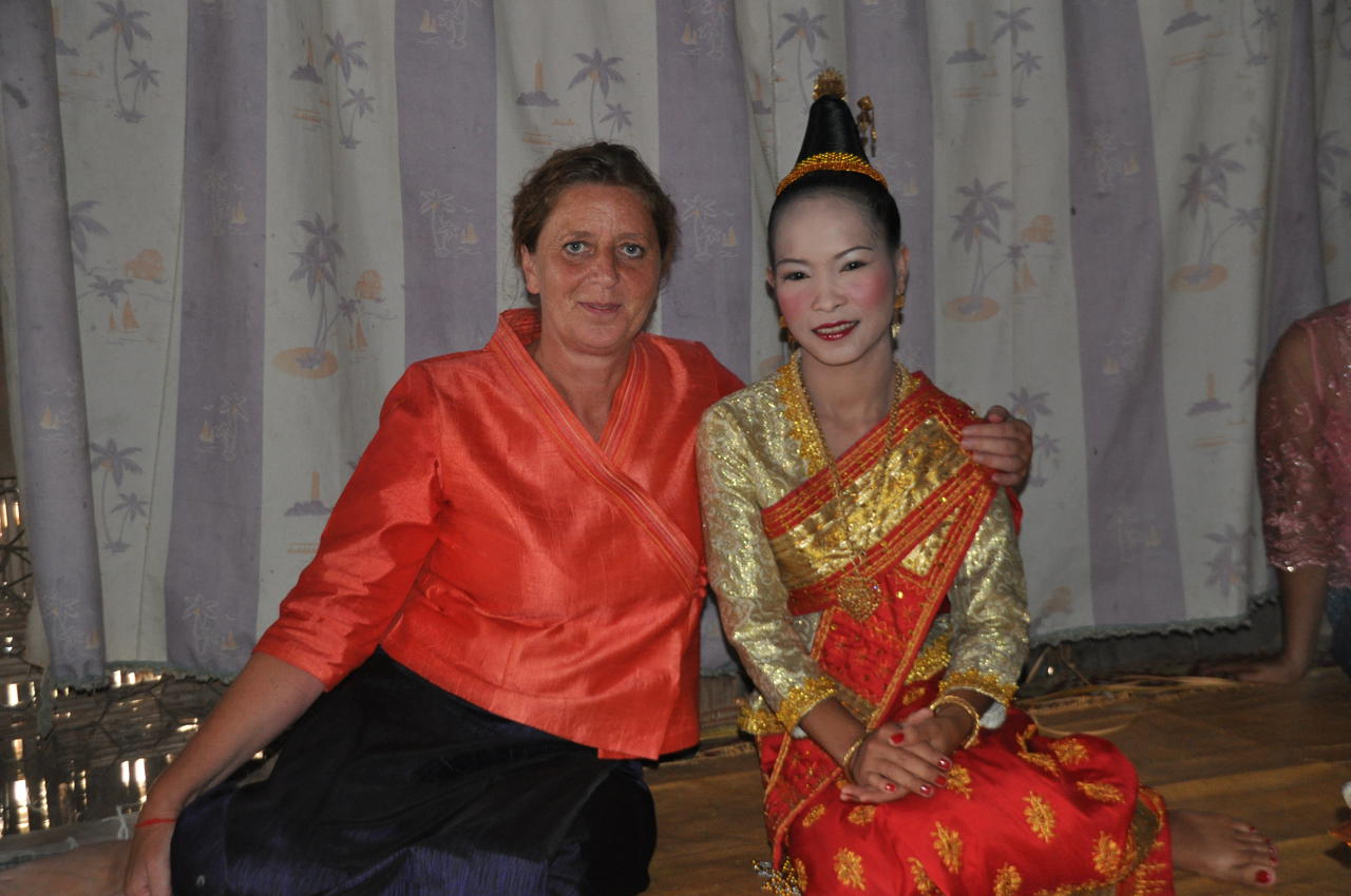 Am nächsten Tag fuhren wir mit dem Moped zur Hochzeit. Ich setzte mich wie im Damensattel seitlich, stellte einen Fuß auf den Fußraster und den anderen Fuß legte ich darüber, hört sich kompliziert und schwierig an, dachte ich auch, aber das ging sehr gut und ich fühlte mich sicher. Thai ist auch ein vorsichtiger Fahrer. Als wir nach ca. 3 km am Ziel ankommen bin ich erst einmal über die Armut schockiert. Auf einem Gelände auf dem ausgediente Schrott-LKW's stehen sind Planen auf Stangen gespannt, darunter stehen Plastikstühle und Klapptische, die mit einer Art (durchsichtg) Plastikfolie bespannt sind. Auf den Tischen (immer mehrere zusammengestellt) befindet sich in Cellophan eingepackte Plastikteller mit essen darauf. Eingepackt sind eine Art Laab (zu Krümel verkleinertes Fleisch mit Kräutern und Glasnudeln und Gewürzen angereichert), Beefsuppe, Teller mit Fleischstücken (wahrscheinlich ebenfalls Beef), Außerdem hatte jeder auf seinem Platz ein Päckchen Sticky Rice und einen Löffel sowie ein paar Essstäbchen liegen. 1 Flasche Wasser pro Tisch, und eine Flasche Lao Lao (Reisschnaps) für zwei Tische, abgefüllt in kleinen Wasserflaschen mit einem Schnapsgläschen oben drauf. Thai hatte mich schon gewarnt, dass Lao Lao sehr stark wäre und sicher viele mit mir trinken wollten, ich aber nicht nein sagen darf. Er meinte ich solle nippen und dann den rest in einer schnellen bewegung auf den Boden schütten. Außerdem erzählte er, dass es normalerweise Beer Lao gäbe, aber die Familien zu arm sind und damit ein Trinkgefühl entsteht sie den Gästen Lao Lao-Schnaps anbieten. Auf dem Gelände steht eine kleine Baracke, in der die Zeremonie stattfinden soll und die Braut auch schon im inneren sitzt und auf den Bräutigam wartet. Es ist brütend heiß einen Ventilator sucht man vergeblich. Die Baracke besteht aus einem Raum, der Boden ist aus Holz und liegt etwa einen halben Meter über der Erde. Er ist mit Plastik ausgelegt und die Wände sind mit Papierausschnitten und Plastikstücken verkleidet, eben was man so findet. Auf dem Boden stehen stehen zwei große Blumengestecke (sonst gibt es nichts), rundherum liegen Früchte, auf einem extra Teller liegt essen (Hühnchenbeinchen, Reis, Eier und anderes was ich nicht zuordnen kann. Die Braut sieht aus wie eine Plastikpuppe, sie ist imGesicht weiß geschminkt. Die Braut bittet mich neben sich, ich bin der Ehrengast und im Moment sitzen außer Thai und mir noch 5 weitere Männer und eine Frau im Raum. Ich frage ob ich Bilder machen kann und die Braut nickt ganz sacht, damit ihr Hochsteckturm auf dem Kopf nicht herunter fällt. Ich mache einige Bilder und einige sind glücklich darüber und andere wiederum schauen ganz schüchtern drein. Thai meint, ich wäre wahrscheinlich die einzige auf dem Fest die Bilder macht. Plötzlich rufen alle irgendetwas von draußen herein. Der Bräutigam kommt und mit ihm seine Verwandtschaft und Freunde. Sie kommen mit Tuk Tuks gefahren. Am Eingang werden sie empfangen und sofort fängt ein unglaubliches Geschiebe und Gedränge an, Sie versuchen den Besuch wieder hinaus zu drängen. Ich schaue etwas verdutzt, aber Thai sagt, das wäre so eine Art Spiel, das sie machen, sie wollen den Bräutigam nicht herein lassen. Doch die Gäste geben dem Gedränge nicht mehr nach und schaffen es letztendlich zumindest auf das Gelände zu kommen. Der Bräutigam trägt ein großes Gesteck in der Hand, das wohl das Brautgeschenk sein soll. Nun gehen sie in Richtung Baracke, dort wird plötzlich die Tür zugeknallt und von innen festgehalten (wohl von den Männern, die vorher drin saßen). Doch auch das hält nicht lange und der Bräutigam wird mit Schwung ins Haus geschoben. Nun ist der Raum bis zum Anschlag gefüllt mit Leuten, auch wir drängen uns hinein um die Zeremonie zu verfolgen. Zuerst spricht der Vater Wünsche und Hoffnungen aus, dann sind einige andere ältere Männer am reden. Als das vorüber ist, müssen sie sich gegenseitig mit dem Essen füttern, was vor ihnen liegt. Dann rücken plötzlich alle ganz nahe an die Brautleute heran und berühren sich, halten die Köpfe gesenkt und murmeln etwas. Nach einer Weile steht ein mann auf, nimmt aus den Gestecken am Boden lange Stäbe an denen Wollbändchen hängen und verteilt sie unter den Gästen im Raum. Auch wir bekommen welche. Nun binden die Leute an vier Bändchen jeweils zu gleichen Teilen Geld. Zwei Bändchen werden danach der Braut und der Bräutigam an die Arme gebunden und dabei spricht man Wünsche aus. Die Brautleute sitzen Rücken an Rücken, immer ein Arm wird nach unten gestreckt, der andere Arm wird mit gestreckter Hand vor die Brust geführt. Dann wird gewechselt. Nach der Zeremonie suchen Thai und ich uns einen gute Platz im Schatten unter einer Plane, mit Sicht auf die Tanzfläche. Dann kommen irgendwann die Brautleute heraus. Am Eingang zum Gelände sind nun in langen reihen Stühle ausgestellt auf denen die engsten Familienangehörige die Brautleute sich setzen und warten. So ca. eine Stunde in praller Sonne. Na freiwillig wurde ich da nicht heiraten wollen, wenn ich in der prallen Sonne sitzen muesste. Wir setzen uns an einen Tisch und im Nu ist er voller Männer . Wir packen das Essen aus und los geht es. Ständig schenkt mir jemand einen Lao Lao ein, das ist ein Reissschnaps der ziemlich hochprozentig ist und in der Hitze kein Spass ist zu trinken. Thai, mein Begleiter sieht schnell das Problem und meint, ich müsste trinken, bzw. ich sollte nur andeuten als wenn ich trinke und ihn dann in einer Schwenkbewegung auf den Boden kippen, das würden viele machen. OK, das kann ich auch. Es war ein guter Tipp, denn den ganzen Tag musste ich (zumindest so machen als ob) trinken. Auch zeigten sich die Lao als Tanzfreudiges Volk und so musste ich einen Tanz nach dem anderen mit ihnen machen. Den Lao-Tanz lernt man leicht, die Schritte sind ganz einfach (Eins Zwei Wechselschritt). Zu zweit, ohne sich zu berühren, tanzt man um einen sogenannten T