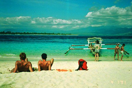 Frueh machen wir uns auf den weg nach bangsal, dazu muessen wir ein bemo nach sweta und von dort nach pemenang nehmen. Von dort geht's per pferdekutsche zum ablegesteg, von wo die boote zu den gilis fahren. Wir chartern zusammen ein boot mit 2 deutschen fuer 15000 r zur insel meno. Der motor faellt oefters waehrend der fahrt aus, aber es springt nach einer weile immer wieder an, so dass wir wohlbehalten dort ankommen. Der deutsche ist uebrigens tauchlehrer, der ueber 2 jahre auf den malediven gearbeitet hat. Wir bekommen ein grosses bungalow fuer 7500 r pro person, 3 mahlzeiten inkl. Den tag verbringen wir am strand mit nichtstun und fusball jambalaya. Abends sitzen wir gemuetlich mit einem berliner paar und einer hollaendischen familie zusammen. Die insel ist ein traum: super strand und sehr ruhig, kaum travellers, sehr angenehm!