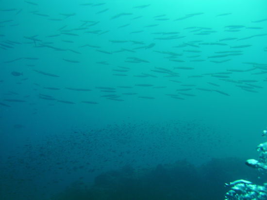 Am zweiten Tag stand dann als erster Tauchspot der "Southwest Pinnacle" auf dem Plan. Es war sehr hoher Wellengang, sodass es dem einen oder anderen wieder mal schlecht wurde... keinem von uns natuerlich. Wir waeren nicht ueberascht gewesen, wenn wir nicht tauchen gegangen waeren, aber zum Glueck sind wir doch in die Wellen gesprungen, denn hier haben wir unseren ersten Walhai gesehen. Die Guides meinten vorher noch, dass wir ab und zu auch mal nach oben schauen sollen, denn so manch einer hat schon einen Walhai verpasst, weil er immer nur nach unten geschaut hat. Wir waren keine 5 Minuten unten, da schnappt Anas nach meinem Bein und ich schnall sofort was los ist und schau nach oben und da schwimmt er, ganz sanft und leise ueber uns drueber. Waere Anas nicht gewesen, haetten wir ihn wohl verpasst . Leider war unser weiblicher Guide ein bisschen bloed, sie zeigte das "ok" Zeichen und schwamm weiter in die andere Richtung des Walhais. Leider mussten wir ja hinter ihr her und der Walhai war schnell nicht mehr zu sehen . Andere Guides schwimmen auf jeden Fall erstmal dem Walhai hinterher, aber nun gut, es sollte ja nicht unser erster und letzter Walhai gewesen sein...