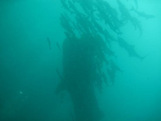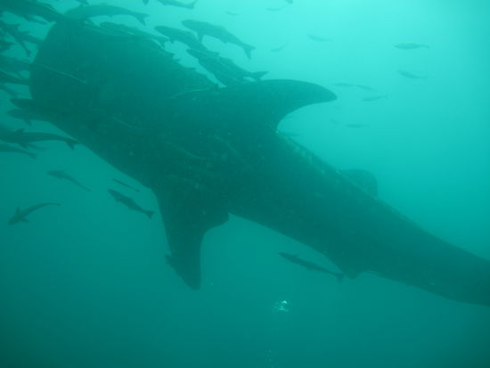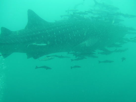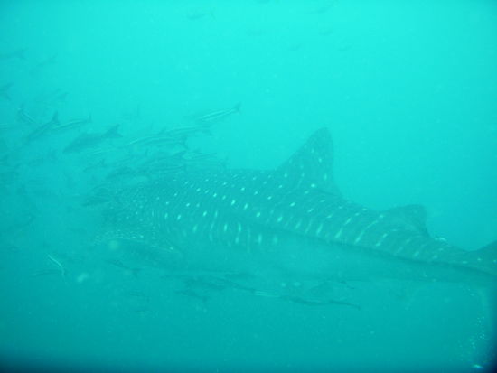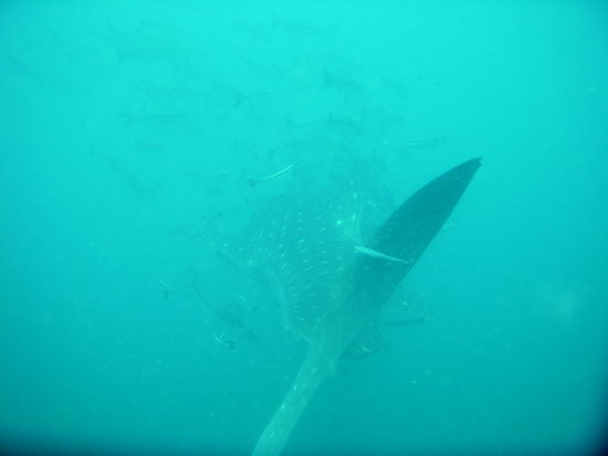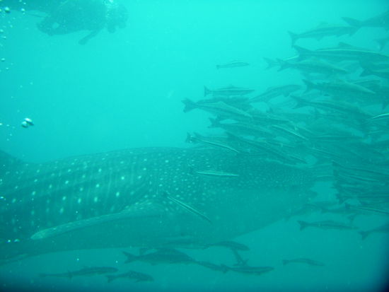 Nach dem ersten Tauchgang machten wir erstmal Pause. Es gab leckere gebratene Nudeln und die Stimmung auf dem Boot war super, denn die Artenvielfalt am Wrack war einfach unglaublich und so freuten wir uns umso mehr auf den zweiten Tauchgang, der ebenfalls am Wrack war. Um uns herum waren noch einige andere Boote mit Tauchern. Ploetzlich brach eine allgemeine Unruhe auf den anderen Booten aus und wir wussten erstmal nicht was los war, bis Michael rief: "Walhai! Schnappt euch eure Brillen und Schnorchel und rein ins Wasser." So schnell konnten wir nicht schauen, da waren alle mit dem Kopf unter Wasser. Unter uns waren gerade Taucher, die das Glueck hatten, den Walhai aus der Naehe zu sehen. Das Wasser war durch den Plankton (wovon sich Walhaie ernaehren) sehr trueb, sodass die Sicht nicht wirklich gut war und durch die vielen Leute im Wasser, kam man irgendjemandem staendig in die Quere. Michael rief uns dann zu, dass wir raus aus dem Wasser sollen und uns fuer den zweiten Tauchgang fertig machen sollen, was wir sofort machten und nach einem kurzen Briefing waren wir 5 Minuten spaeter wieder im Wasser und diesmal richtig. In dem Briefing, erzaehlte Michael uns noch, dass wir immer zusammen bei ihm bleiben sollen und nicht einfach dem Walhai hinterherschwimmen sollen, als gaebe es nichts anderes. Schon klar dachte ich. Nachdem wir abgetaucht waren und Michael uns gerade fragte, ob alles ok ist, kam der Walhai ploetzlich aus dem Nichts direkt auf uns zu. Ich streckte nur meinen Arm aus und deutete auf den Walhai und versuchte mit merkwuerdigen Lauten aus meinem Mundstueck darauf aufmerksam zu machen und endlich drehte sich Michael um und schwomm hinter dem Walhai her und wir hinter Michael. Natuerlich waren wir nicht die einzigen Taucher, sondern im Wasser wimmelte es von Tauchern. Ich verlor die anderen dann doch schnell aus den Augen, dachte mir aber, die werden schon irgendwo sein. Ueber mir schwamm ein Paerchen Haendchenhaltend und ich dachte das seien Dani und Anas und machte mir also keine Gedanken und schwamm weiter. Irgendwann schnappte jemand nach meinem Bein, ich drehte mich um und ein sehr boeser Stefan schaute mich durch die Taucherbrille an uns fuchtelte wild mit den Armen umher und zeigte mit den Daumen nach oben, was bedeuten sollte: "Haste super gemacht!". Als ich mich wieder umdrehte war der Walhai und die anderen Taucher schon fast nicht mehr zu sehen und Stefan deutete in die andere Richtung. Wir schwommen ein kurzes Stueck zurueck, doch da die Sicht so trueb war, entschieden wir uns an die Oberflaeche zu gehen. Kaum an der Oberflaeche bekam ich erstmal einen gehoerigen Anschiss von Stefan, zurecht geb ich ja zu. Die Boote waren schon ein Stueck weit weg und wir zeigten erstmal das OK Zeichen. Fuer mich war klar, dass der Tauchgang nun zu Ende war. Er hatte zwar nur ein paar Minuten gedauert, sich aber mehr als gelohnt . Doch als wir endlich wieder am Boot waren, war auch Michael an der Oberflaeche und rief uns zuruck an die Boje. Er schaute mich an, sagte: "was hab ich vorher noch im Briefing gesagt (wobei er grinste)? Sei froh dass du so einen guten Buddy hast und jetzt Mundstueck rein und runter mit euch." Unten an der Leine warteten Dani uns Anas und schauten uns besorgt an, doch wir waren ja okay. Am Wrack war es dann wieder super, aber ich war immer noch hin und weg von dem Walhai. Anas und ich hatten immer zuerst keine Luft mehr und waren dann zuerst wieder auf dem Boot. Ich rechnete ja schon noch mit einer Standpauke von wem auch immer, aber es wurde nur gelacht und zum Glueck ist ja auch nix passiert.