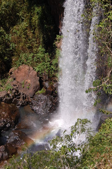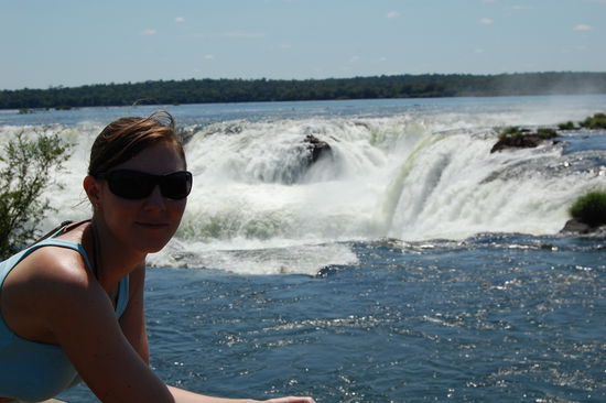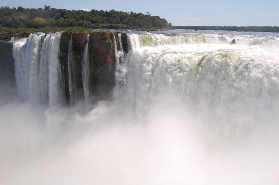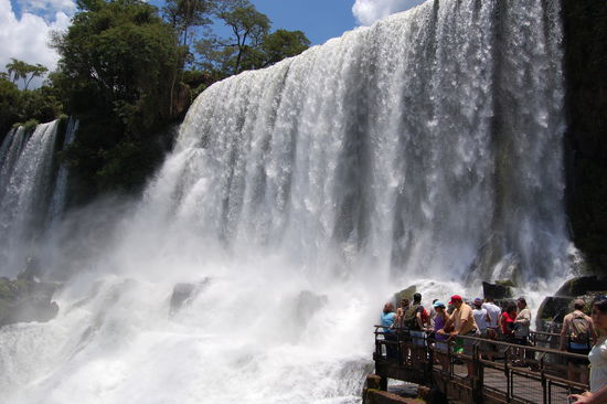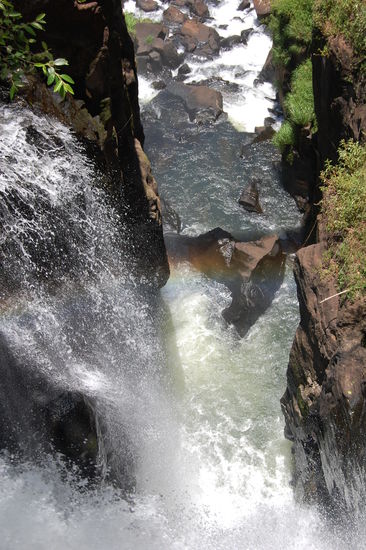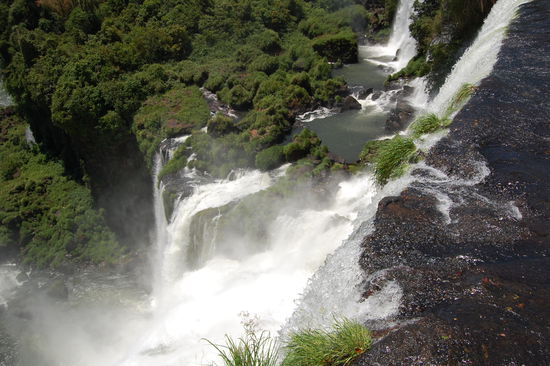 Als erstes fuhren wir mit einem kleinen Baehnchen zu dem Punkt, von wo aus man direkt zum "Garganta del Diablo" auch teufelschlund genannt kommt, der Hoehepunkt der argentinischen Wasserfaelle, weil man von der brasilianischen Seite dort nicht hinkommt. Dort steht man direkt am Rand, der herabstuerzenden Wassermassen. Das Donnern und Tosen der Wassermassen ist total laut und ab und zu kann es ganz schoen nass werden.