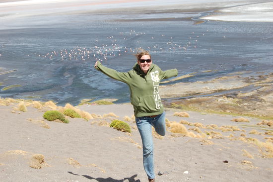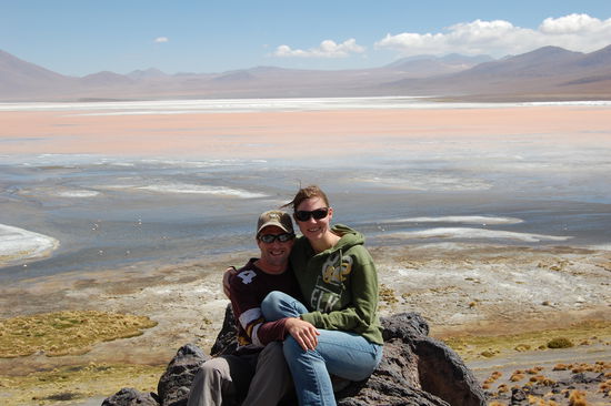 Die Laguna Colorada, eine der bekanntesten Lagunen des südlichen Teils des Altiplanos in einer Hoehe von 4278m.