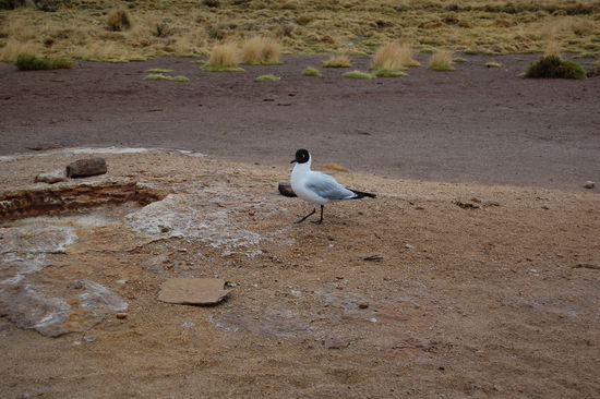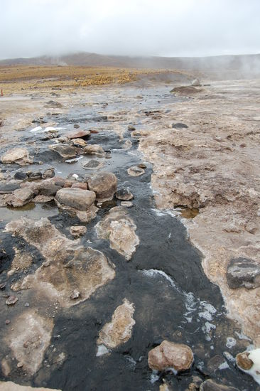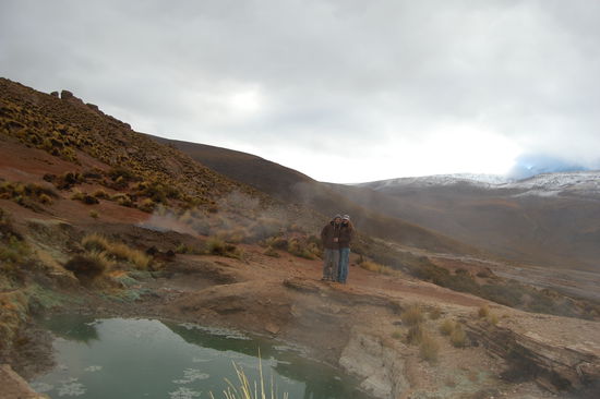 Die heissen Quellen von El Tatio. Hier sieht man sehr schoen, wie das Wasser in das Becken laeuft. Und natuerlich sind wir auch hier wieder baden gegangen (ich mit Top...) nachdem das in Bolivien so toll war. Nur leider war das Wasser hier nur so um die 24 Grad warm und als wir rauskamen, war auch keine Sonne da, sodass wir diesmal richtig gefroren haben, brrr.