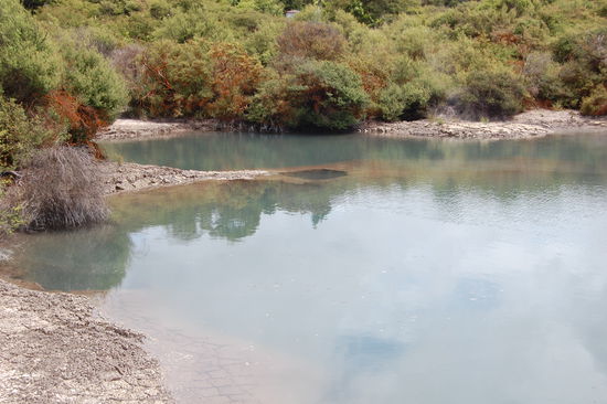Direkt neben unserem Campground ist ebenfalls wie ueberall ein qualmender und stinkender Wassertuempel. Ausserdem gibt es einen Erdofen, in dem man sein Essen durch Erdwaerme garen kann und natuerliche heisse Pools, die man kostenlos nutzen darf, herrlich.