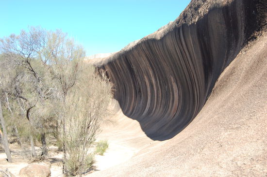Der Wave Rock ist eine etwa 2,7 Milliarden Jahre alte Granit-Gesteinsformation, die durch Erosion und Witterung zu einer Welle geformt wurde. Schon die Aborigines nannten ihn eine Welle aus Gestein. Die Welle ist 15 Meter hoch und etwa 110 Meter lang.