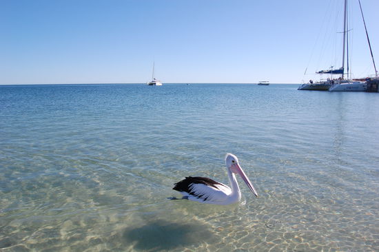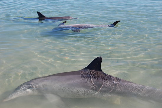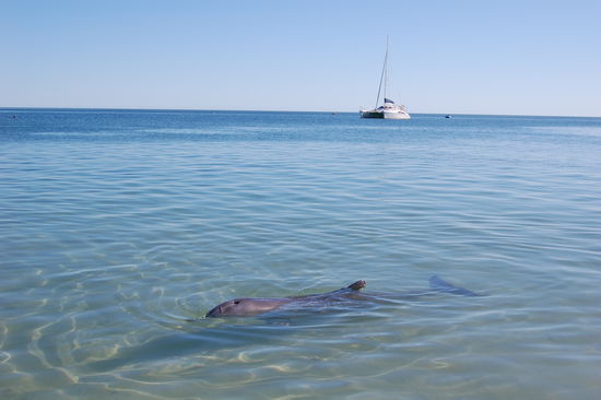 Die Hauptattraktion der Shark Bay ist defintiv Monkey Mia. Wie schon in Bunbury kommen hier taeglich wilde Delphine direkt an den Strand. Allerdings werden sie hier 3x vormittags gefuettert, was so gut wie garantiert, dass sie irgendwann auftauchen. Doch auch nachmittags sieht man sie immer sehr nah am Strand schwimmen. Wir waren 2 Tage dort um ein bisschen auszuspannen und konnten deshalb mehrmals die Delphine hautnah erleben und hatten wieder einmal Glueck, denn es war nicht wirklich ueberlaufen wie es sonst immer heisst.