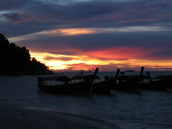 Kostenlose Kleiderwaesche inkl. Denn trocken bleibt auf diesem Boot keiner. Eins waere noch angemerkt, HINTEN SITZEN ist angesagt, man bekommt zwarmehr Wasser ab, aber es isr "ruhiger". Nun, das Wetter isthier besser - naja waermer und es regnet nicht. Zudem ist diese Insel wunderschoen und unser neues Resort (Mountain Resort) ist ne Wucht! Zusaetzlich hatten wir gestern den schoensten Sonnenuntergang seit wir in Thailand sind! ROMANTISCH !!!!
