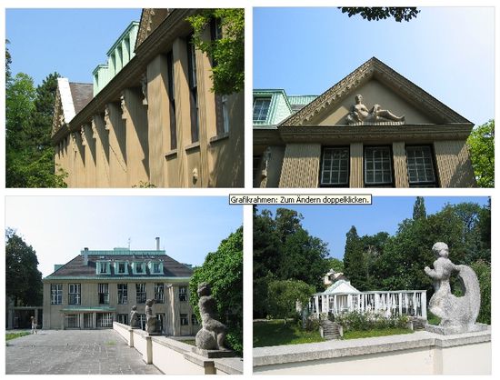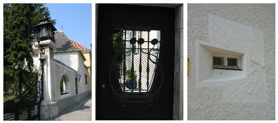 In der Auhofstraße 13-15 bzw. in der Hietzinger Hauptstraße 40 (Vorderansicht) liegt die großzügige Villa Wustl. Au den ersten Blick fallen nur die Sprossenfenster auf, ohne direkten Bezug zum Jugendstil, erst die die beiden Vasen von Oerley - für die Secession entworfen - lassen dies erkennen.
