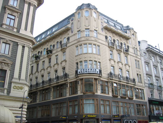 Ein weiteres Hauptwerk von Adolf Loos ist der Schneidersalon Knize. Das zweigeschossige Geschäft ist nur durch einen schmalen Eingang im mit Granit beschlagenen Portal zu betreten und fällt kaum auf. Innen ganz 'fürnehm' mit Wendeltreppe und voller Holzverkleidung