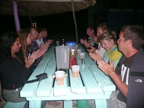 zum abendessen gab es dann wieder ceviche aber diesmal mit scampis und natuerlich wieder der frische fang vom tag. als wir das abendessen beendet haben, haben die einheimischen angefangen zum rythmus von trommeln zu tanzen und zu singen. auch diese nacht war sehr speziell denn der mond war immer noch fast voll und die klaenge der trommeln haben einem richtig in trance versetzt.