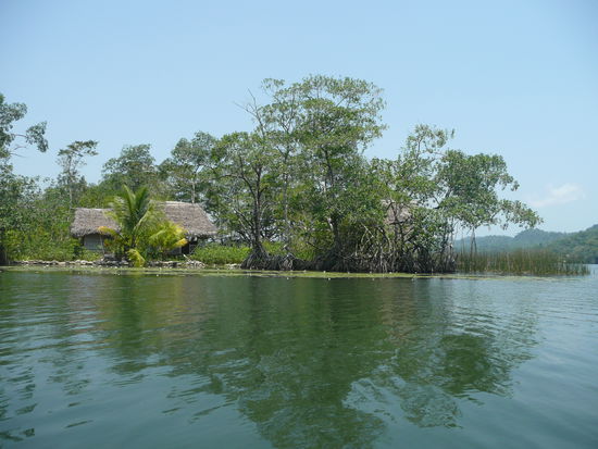 die bootsfahrt war wunderschoen! links und rechts ist einfach nur dschungel und ganz einzeln verstreut sieht man kleine holzhaeuser mit einem dach aus palmenblaettern. man fuehlt sich irgendwie in der zeit zurueckversetzt und kann das urspruengliche guatemala so richtig geniessen. vereinzelt konnte man frauen beobachten die ihre waesche im fluss wuschen oder maenner die auf ihren kleinen kanus fische fingen. alles hier war ruhig und entspannt.