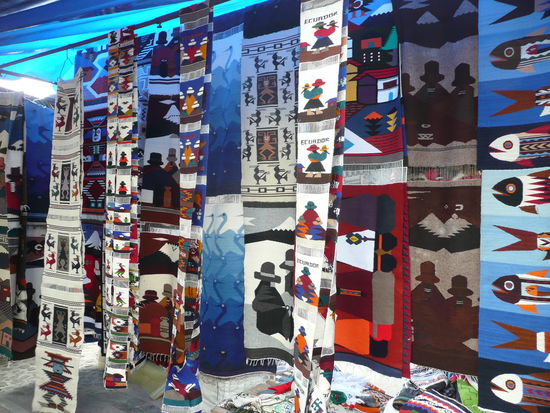 otavalo 2550m ueber meer mit 31000 einwohner ist beruehmt fuer ihren riesigen samstagsmarkt, auf dem die einheimischen in traditioneller tracht ihre kunsthandwerke an horden von kauflustigen touristen anbieten.