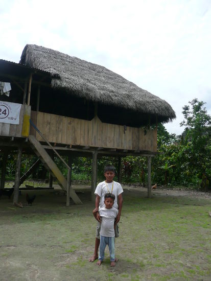 am nachmittag stand eine bootsfahrt auf dem rio napo auf dem programm und ein mittagessen bei einer familie die auf einer der inseln im fluss lebt. dort angekommen mussten wir auch schon frische, schleimige kakaobohnen probieren. erstaundlicherweise war das sogar geniessbar ;o). danach wurden wir ins haus gefuehrt und bekamen auf bananenblaettern kochbananen, yuca und kleine komischaussehende fische aus dem fluss zu essen. es war wirklich sehr lecker und die athmosphaere sehr speziell.