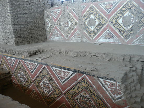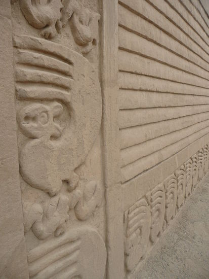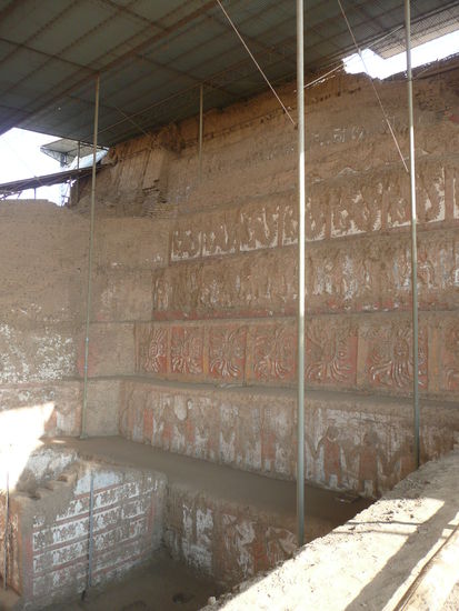 die huaca del sol ist perus groesstes praekolumbisches bauwerk. um es zu errichten, wurden 140 mio adobeziegel verwendet und die waende haben eine neigung von 77%. heute erinnert die pyramide eher an einen riesigen sandhaufen aber es ist trotzdem sehr beeindrucken. leider kann man diesen tempel nicht betreten jedoch die huaca de la luna schon.