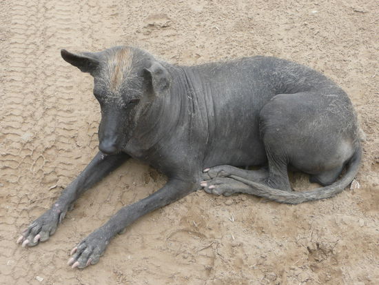 weiter gings zu dem tempel la huaca esmeralda. dieser chimu-lehmziegeltempel ist eine plattform mit stufen und ist der einzige tempel der nicht restauriert wurde. hier konnte man auch die fuer alle tempel beruehmten haarlosen hunde begutachten. die koerpertemperatur dieser hunde ist hoeher als die normaler hunde. sie wurden in der traditionellen medizin als koerperwaermer fuer menschen mit arthritis benutzt.