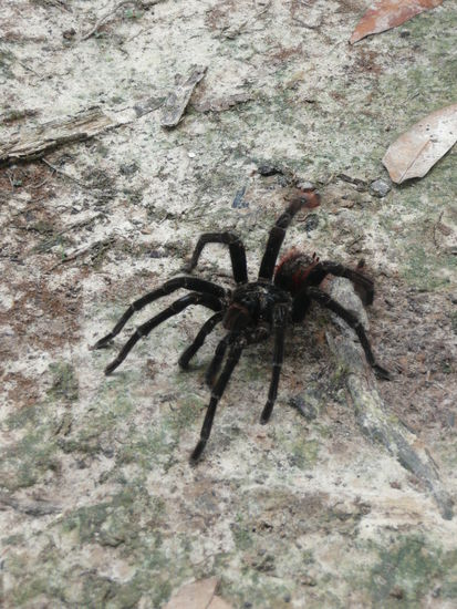 an einem anderen tag hat uns ein guide ein paeckchen aus bananblaettern gebracht. er meinte er haette uns eine kleine tarantel mitgebracht. und schon hat er sie ausgepackt und auf den boden gelegt. jetzt koennt ihr euch mal vorstellen wer zuerst einen schrei abgelassen hat... natuerlich ich denn diese kleine spinne war das groesste 8beinige wesen das ich je gesehn habe. und die die mich kennen wissen, dass spinnen nicht gerade zu meinen lieblingstieren gehoeren. wow ich kriege jetzt noch schweissausbrueche wenn ich daran denke. natuerlich habe ich mich trotzdem nahe heran gewagt um ein paar gute fotos zu schiessen. habe jedoch bestimmt einen liter schweiss vergossen .