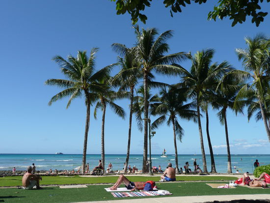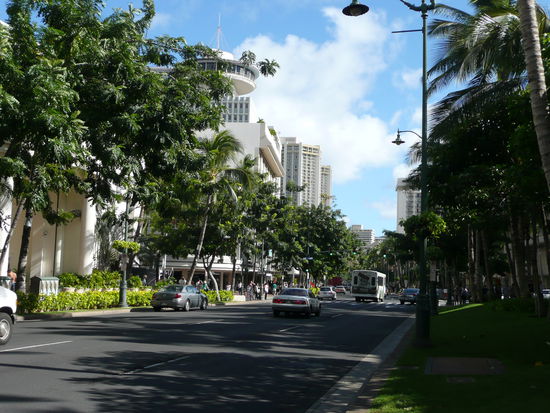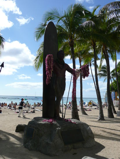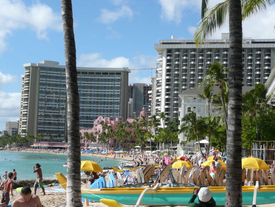 Waikiki ist wirklich ein pulsierender ort. es ist viel los, man kann sich einfach alles kaufen und die strassen sind gesaeumt von palmen. wenn es dunkel wird sind viele restaurants und hotels mit fakeln beleuchtet und die menschen hier sind sehr freundlich. aber was mich stoert und was mir fehlt hier ist das wahre hawaii... wenn du am strand liegst und nach oben schaust hast du das gefuehl in new york vor einem hochhaus zu liegen. anstatt das meer rauschen hoerst du den strassenlaerm und platz um dein badetuch hinzulegen hast du auch nicht wirklich. waikiki ist wie eine insel auf der insel halt einfach anders als der rest und trotzdem hat dieser ort was...