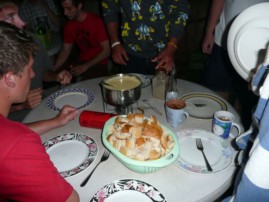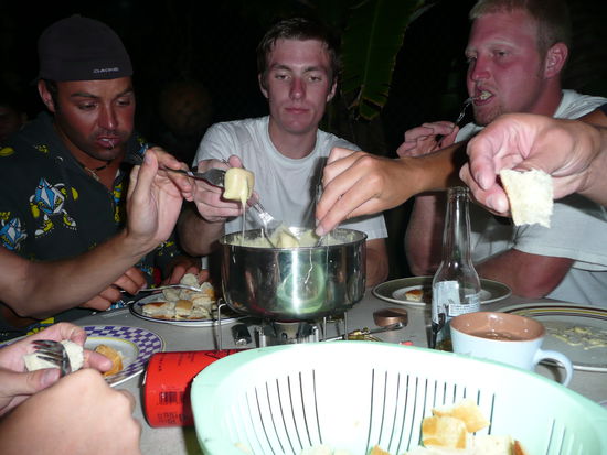 am letzten abend haben wir zum abschied ein fondue gemacht. wir waren 4 schweizer und viele die probieren wollten. kaese fondue in maui was fuer eine komische mischung ;o)
