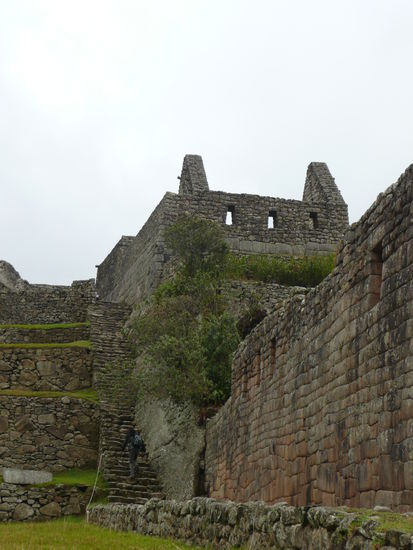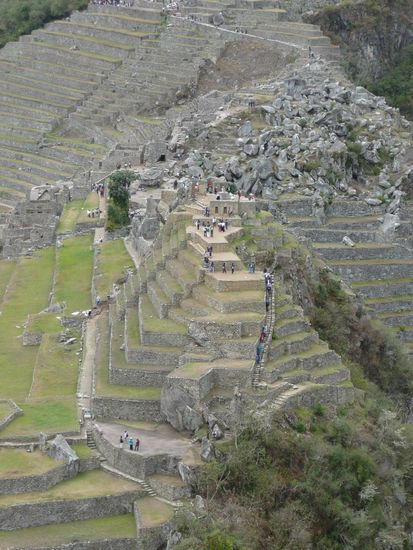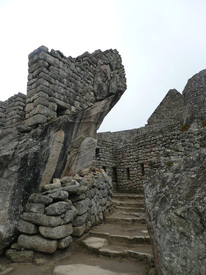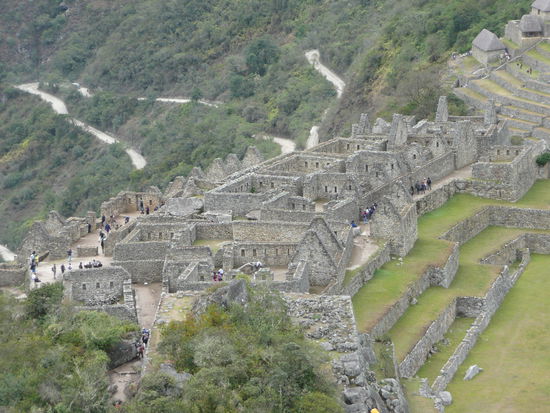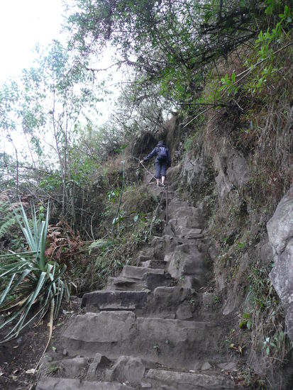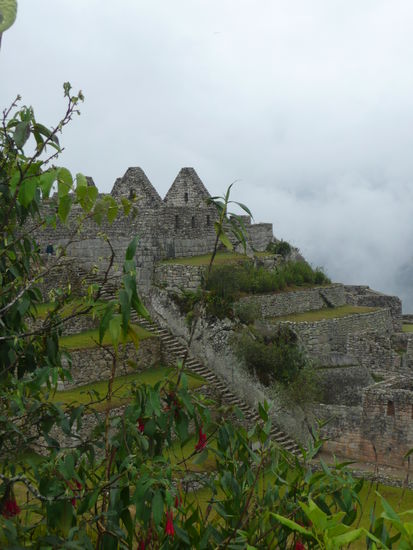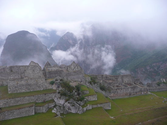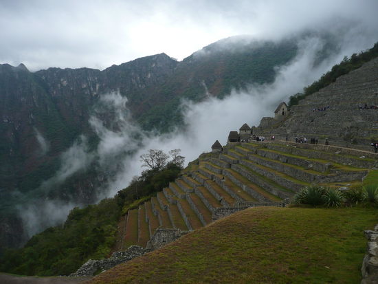 Wir machten uns gleich auf den weg zur huette des verwalters, von wo aus man die beruehmte postkarten aussicht auf machu picchu hat mit den 2 tollen bergen im hintergrund. Die idee war natuerlich super, denn es hatte noch fast keine turisten in der anlage und kein gelbes oder rotes t-shirt konnte unser foto beeinflussen. Leider hat uns auch hier der nebel einen strich durch die rechnung gemacht, denn die beiden berge waren kaum oder gar nicht zu sehen. Mit der hoffnung auf schoeneres wetter gegen mittag, schlenderten wir durch die anlage, die kamera immer griffbereit . Irgendwie hatte der nebel etwas mystisches ansich und so frueh am morgen waren die vielen turisten noch sehr ertraeglich. Man konnte sogar ein foto ohne turisten im hintergrund schiessen ;o). Da wir am eingang glueck hatten und eine nummer fuer die besteigung des wayna picchu erhalten haben, haben wir uns um 08:00 uhr zum eingang auf der anderen seite der anlage begeben. Pro tag duerfen nur 400 menschen den wayna picchu besteigen. Langsam und steil fuehrte der weg nach oben. Der enge pfad besteht aus treppen mit unterschiedlich grossen stufen und es geht ganz schoen in die beine. Ploetzlich hat es wieder angefangen zu regnen und wir haben schon beim aufstieg gesehen, dass wir vor lauter neben wahrscheindlich ueberhaupt nichts sehen wenn wir oben angekommen sind. Die aussicht von der spitze auf die gesamte anlage von machu picchu gilt als einzigartig und desshalb gaben wir die hoffnung nicht auf. leider vergebens denn nach einer stunde klettern sind wir oben angekommen und sahen nur weiss... wir setzten uns nass wie wir waren auf einen felsen und warteten bestimmt eine halbe stunde wenn nicht laenger, leider ohne erfolg. Der nebel hatte sich nicht einbisschen gelichtet. Einbisschen enttaeuscht machten wir uns auf den abstieg und kaum waren wir auf dem weg, lichtete sich der nebel fuer einen kurzen augenblick und wir konnten einen blick auf die ruinen erhaschen. Auf halbem weg war dann der neben ploetzlich weg... ich war schoen ziemlich enttaeuscht, dass wir nicht das glueck hatten diese aussicht von oben zu geniessen. darfuer machten wir uns auf den weg, den kleineren berg huayna picchu zu besteigen. Der aufstieg war einbisschen muehsamer und schwieriger dafuer waren wir die einzigen auf diesem berg und konnten die aussicht in ruhe in uns aufsaugen und geniessen. Als wir uns von diesem anblick endlich loesen konnten, beschlossen wir noch einmal durch die ganze anlage zur huette des verwalters zu laufen um die postkarten aussicht ohne nebel zu fotographieren. Wow dieser anblick werde ich nie vergessen!!!
