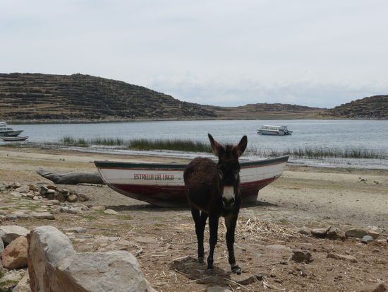 nach dem wir copacabana besichtig haben, fuhren wir am naechsten tag mit einem noch langsameren boot als in puno, zur isla del sol. eigentlich kommt man auch nur nach copacabana um diese insel zu besuchen... so auch wir. ueber die isla del sol gibt es viele geschichten. zum beispiel sagt man, dass hier die inka erschaffen worden sind und dies sogar der geburtsort der sonne sein soll... klingt irgendwie romantisch ;o). auf der kleineren insel die isla de la luna steht ein verfallenes kloster, in dem einst die jungfrauen der sonne wohnten. diese insel ist weniger touristisch und liegt neben der isla del sol. wir haben uns jedoch nur die insel der sonne angesehen. hier leben ca. 5000 einwohner und doppelt so viele esel, schafe und alpakas .