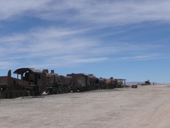 unsere tour startete beim cementrio de trenes. dies ist ein friedhof von alten verrosteten zuegen. wie lange diese zuege schon dastehen weiss ich nicht, denn unser guide hat sich mehr oder weniger nur als fahrer rausgestellt und hat keine wirkliche erklaerung zu den verschiedenen orten abgegeben. es war interessant und doch langweilig. die vielen touristen machten den ort auch nicht mysterioeser und somit gingen wir zurueck zum jeep um weiter zu den salzminen zu fahren.