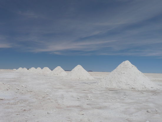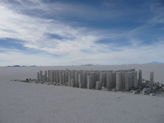 colchani sind salzbloecke die aus der wuestenoberflaeche herusgeschnitten werden um damit haeuser zu bauen oder fuer tiere als futter verwendet werden. sah von weitem aus wie new york wie sie so aufgetuermt vor uns auftauchten . die salzoberflaeche dieser umgebung war so glatt das es einfach atemberaubend schoen aussah! der weisse boden mit dem blauen himmel... einfach fantastisch!