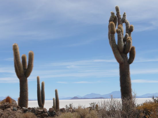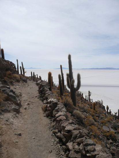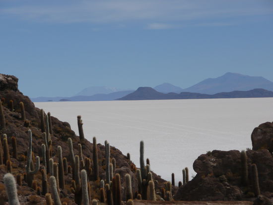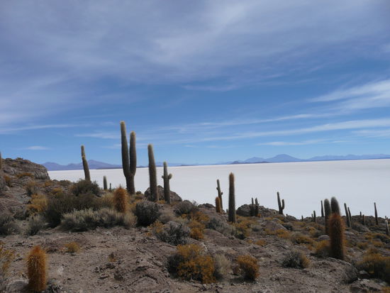 nachder hotelbesichtigung fuhren wir zum mittagessen zur isla de los pescados oder auf quechua isla incawasi genannt. diese insel ist einer der vielen koralleninseln die in der salar de uyuni zu bewundern sind. Sie ist ueberfuellt mit kakteen und der kontrast zu dem weiss und dem blau des himmels ist einfach wunderschoen! nachdem wir auf den kleinen mirador der insel gelaufen sind und unzaehlige fotos geschossen haben, gab es stakes, quinoa und salat zum mittagessen. unsere koechin kocht nicht mal so schlecht . auf besuch kam auch noch ein kleiner strauss bevor wir uns wieder auf den weg machten und in richtung colchani fuhren.
