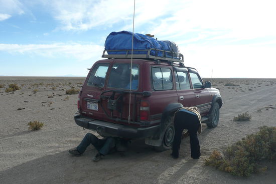 nachdem wir um 08:00 uhr morgens mit dem bus in uyuni ankamen, hatten wir noch zeit fuer ein fruehstueck bevor die tour um 10:30 losgehen sollte. wir waren im ganzen 6 abenteuerlustige die zusammen in den engen 4x4 jeep stiegen. wir waren 4 schweizer, ein mexikaner und ein australier. gepaeck kam oben drauf und der fahrer und seine frau die koechin waren auch noch dabei...