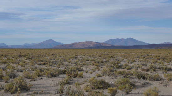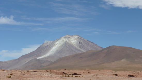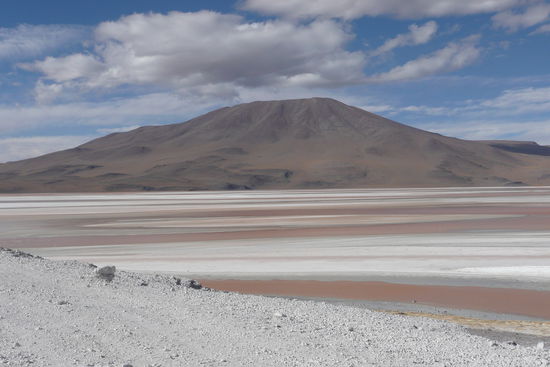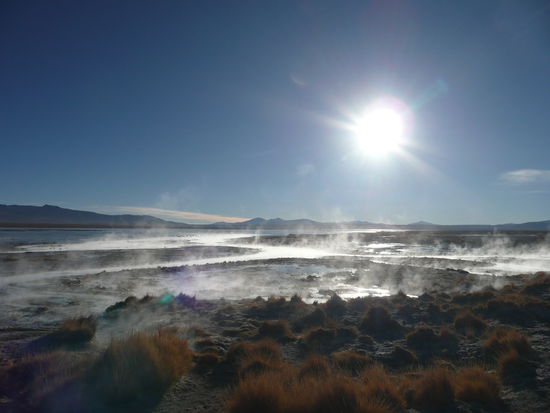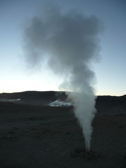 der beginn unseres zweiten tages startete mit einem wunderschoenen sonnenaufgang. kurz nach unserer abfahrt passierte etwas ungeplantes und zwar ging uns wort woertlich die luft aus . ja wir hatten einen platten und somit musste unserer fahrer erstmal das rad wechseln. in der zwischenzeit konnten wir die wunderschoene landschaft im licht der fruehen morgenstunden geniessen. das radwechseln dauerte nicht sehr lange und schon waren wir auf dem weg zum aussichtspunkt auf den vulkan de ollague. dieser vulkan ist noch sehr aktiv und man konnte von weitem rauch aufsteigen sehen. die landschaft bei diesem mirador war sehr steinig. etwa so stelle ich es mir auf dem mond vor jedoch ohne grasbuesche am boden . es war einfach wundeschoen!