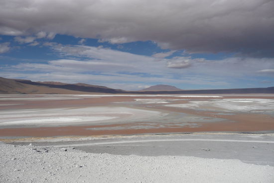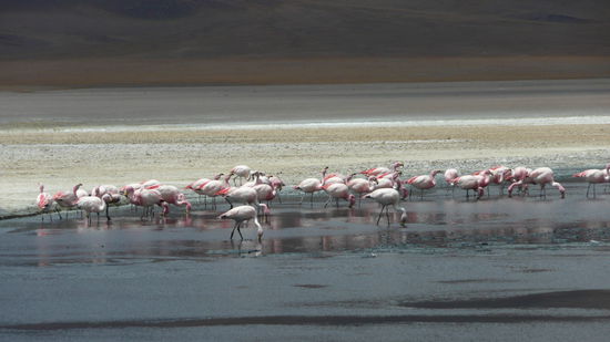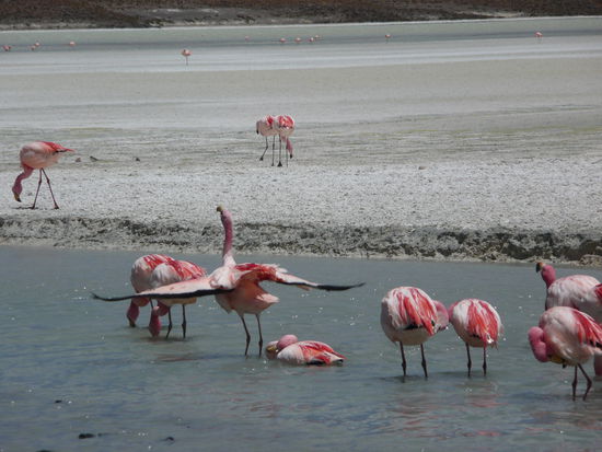 die letzte station dieses wunderschoenen zweiten tagen, ist die laguna colorado. diese lagune ist eines der 7 naturweltwunder und die farben sind einfach atemberaubend. eine lagune die in den farben weiss, blau und rot schimmert ist wirklich sehr speziell! Leider konnten wir den anblick nicht lange geniessen, denn der wind war unglaublich stark und eiskalt, dass es richtig ungemuetlich war. dort haben wir auch uebernachtet nur dieses mal gab es kein doppelzimmer sondern die ganze gruppe teilte sich eines. ich habe noch nie ein bett gesehen wo die matraze auf einem steinblock steht . es war jedoch erstaundlich bequem aber einfach zu kalt. Somit freuten wir uns natuerlich um so mehr auf den tee ond die heisse schokolade die es auch heute gab und das abendessen war auch toll. Es gab wieder die ersehnte suppe und spaghetti bolognese. Dazu bekamen wir sogar eine flasche wein die wir mit hochgenuss und in der hoffnung, dass es von innen einbisschen waermt, getrunken haben. Da man in dieser kaelte nicht noch gemuetlich etwas rumsitzt und wir am naechsten tag bereits um 04:30 uhr aus den federn mussten, gingen wir nach dem abendessen auch schon ins bett...