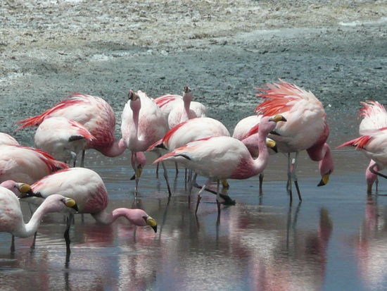 nachdem wir den vulkan und die umgebung fertig bewundert haben, zu den 2 lagunen hedionda und canapa. diese beiden lagunen sind beruehmt fuer ihre flamingos und ich habe mich sehr darauf gefreut. es war das erste mal fuer mich, flamingos in freier wildbahn zu beobachten. ich musste mich richtig bremsen, dass ich nicht die ganze speicherkarte vollknipse . bei der laguna canapa haben wir dann auch unser mittagessen eingenommen. dieses mal gab es poulet milanese, salat und teigwaren. das war noch besser als unser erstes mittagessen.
