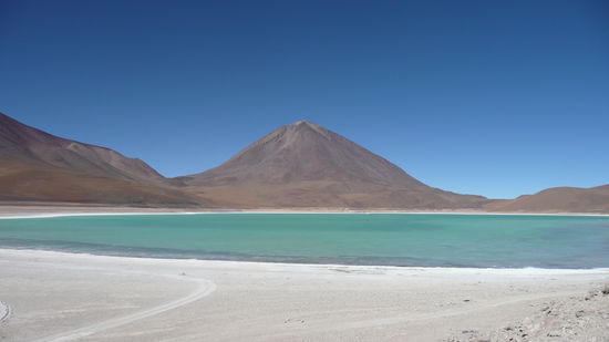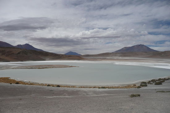 die laguna verde, einfach nur traumhaft. die kulisse mit dem vulkan lincacabur macht das ganze bild perfekt. anscheinend ist diese lagune nur gruen wenn es stark windet, denn dann gibt es eine art reaktion mit den bakterien die darin leben. zum glueck hat es so richtig stark gewindet... brrrr...